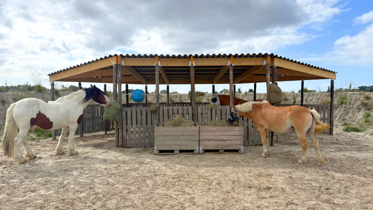 Paarden hebben 3 basisbehoeften: Onbeperkt ruwvoer (zoals hooi), vrije bewegingsruimte en sociaal contact (vriendjes). Op onze Paddock Paradise hebben ze alle drie. Dag en nacht. Het hele jaar rond. Ze mogen zelf kiezen of ze onder een van de schuilstallen staan of buiten. Ze mogen zelf kiezen of ze eten, spelen, rennen, slapen of een duik nemen in de poel. Dit maakt de paarden gelukkig. En daarmee ons ook!